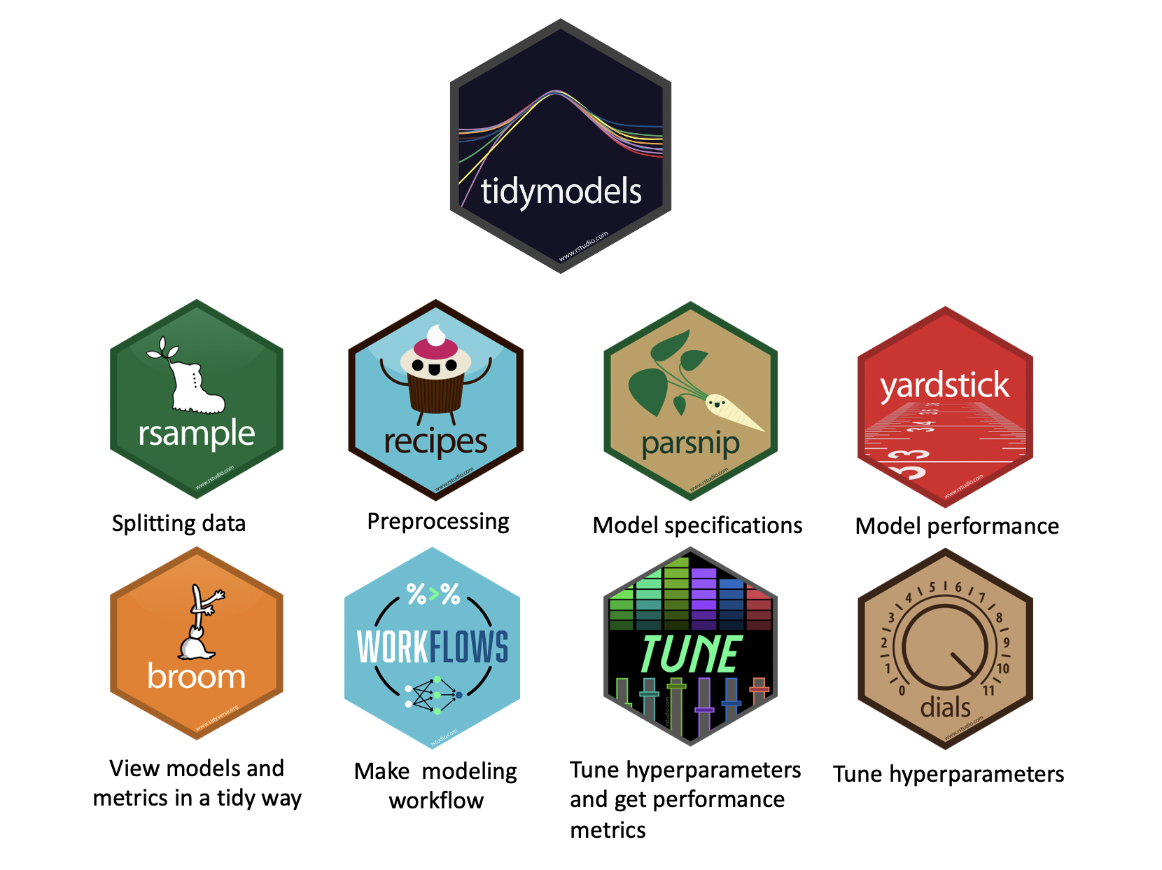 parsnip package provides various modeling engines for different algorithms like lm(), glm(), randomForest(), xgboost(), etc.recipes package, allowing for seamless data transformation and feature engineering.rsample package supplies efficient methods for handling data splitting, cross-validation, bootstrapping, and more.yardstick package gives a wide range of evaluation metrics to assess model performance and choose the best model.tune package facilitates hyperparameter tuning for the tidymodels packages.workflows package can bundle together your pre-processing, modeling, and post-processing requests. The advantages are: