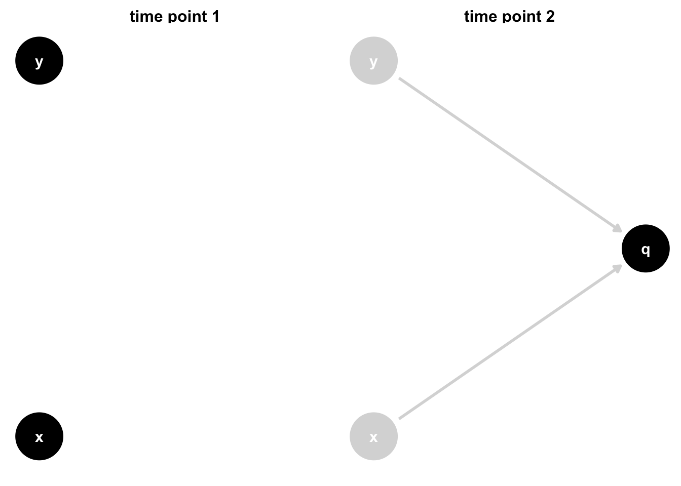 Figure 3: A collider relationship over two points in time. At time point one, there is no relationship between x and y. Both cause q by time point two, but this does not change what already happened at time point one.