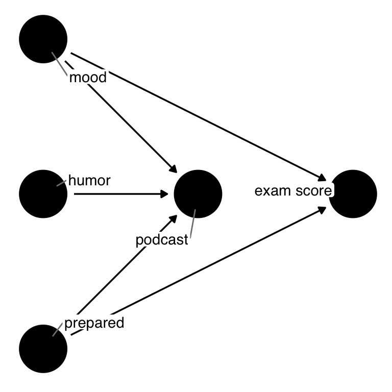 Chains, on the other hand, represent a series of arrows going in the same direction. Here, q is called a mediator: it is along the causal path from x to y. In this diagram, the only path from x to y is mediated through q.