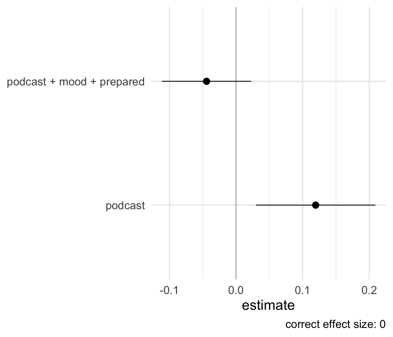 We’re now ready to use the ATE weights to (attempt to) account for confounding in the naive linear regression model. Fitting such a model is pleasantly simple in this case: we fit the same model as before but with weights = wts, which will incorporate the inverse probability weights.