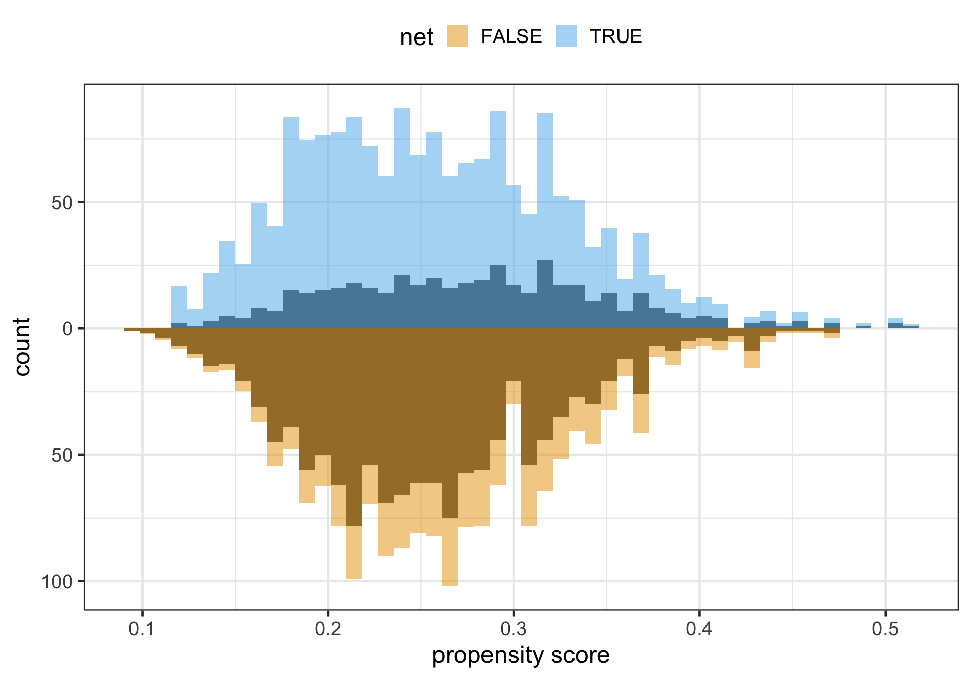 Note that the IPW estimate is based on a model that predicts net usage from income, health, and temperature, and then predicts malaria_risk from net usage. In contrast, the linear model predicts malaria_risk from net usage, controlling for income, health, and temperature.