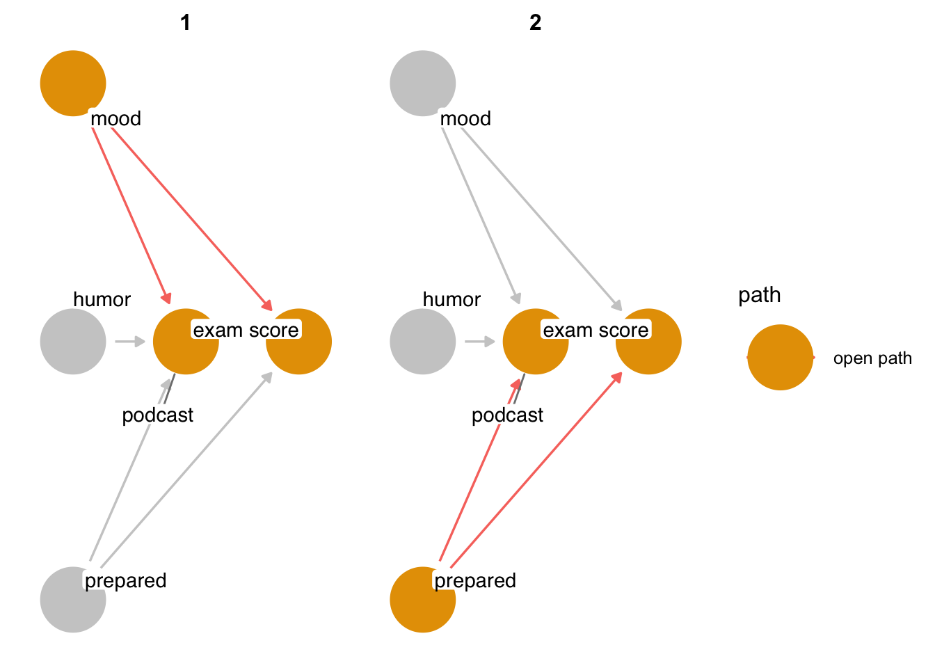 x and y will be correlated, despite there being no arrow from x to y.x and y are correlated through q.x and y will not be correlated.Paths that permit correlation between two variables are called open paths. Paths that do not permit correlation are called closed paths. Forks and chains are open, while colliders are closed.