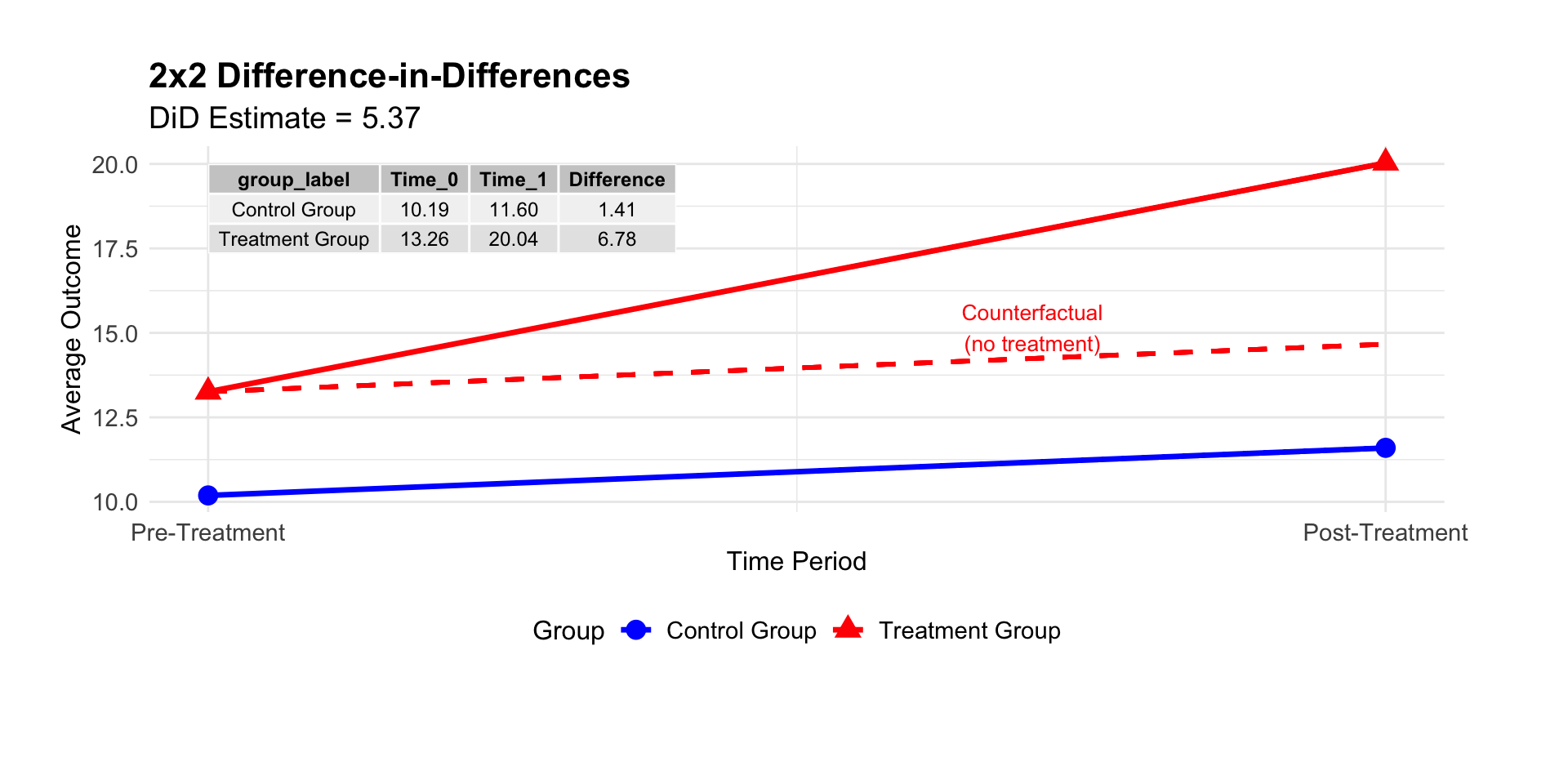 Under our assumptions, we can model the outcome evolution and estimate the counterfactual untreated outcome in period 2 for the treated group using regression, and our estimator