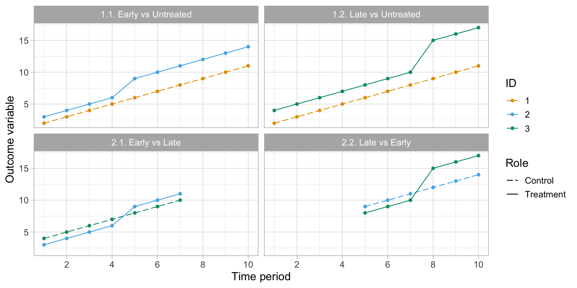 rbind( dat4_rev |>subset(group_id %in%c(1,2)) |>transform(role =ifelse(group_id==2, "Treatment", "Control"), comp ="1.1. Early vs Untreated"), dat4_rev |>subset(group_id %in%c(1,3)) |>transform(role =ifelse(group_id==3, "Treatment", "Control"), comp ="1.2. Late vs Untreated"), dat4_rev |>subset(group_id %in%c(2,3) & period_id<8) |>transform(role =ifelse(group_id==2, "Treatment", "Control"), comp ="2.1. Early vs Late"), dat4_rev |>subset(group_id %in%c(2:3) & period_id>4) |>transform(role =ifelse(group_id==3, "Treatment", "Control"), comp ="2.2. Late vs Early")) |>ggplot(aes(period_id, outcome, group = group_id, col =factor(group_id), lty = role)) +geom_point() +geom_line() +facet_wrap(~comp) +scale_x_continuous(breaks = scales::pretty_breaks()) +scale_linetype_manual(values =c("Control"=5, "Treatment"=1)) +labs(x ="Time period", y ="Outcome variable", col ="ID", lty ="Role") +theme_light(base_size =14)