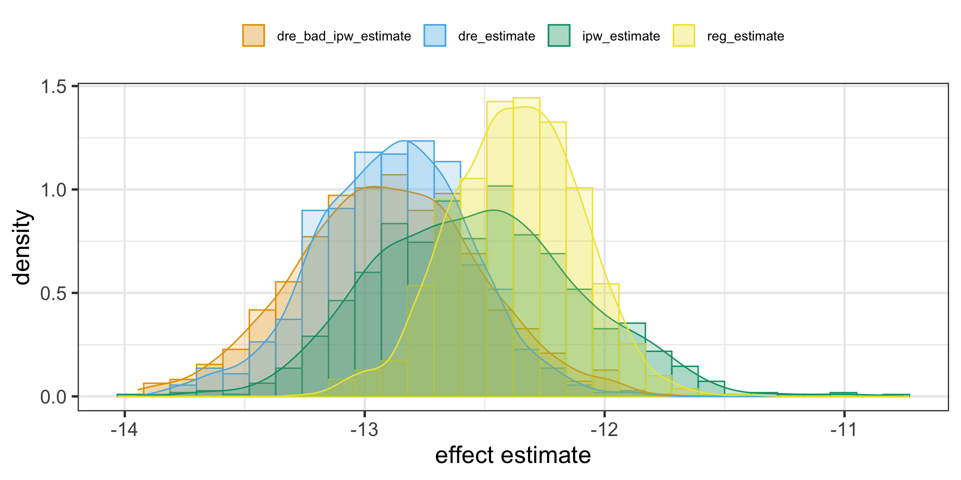 Here we deliberately bias the IPW estimate by replacing the propensity score by a random uniform variable that goes from 0.1 to 0.9 (we don’t want very small weights to blow up the propensity score variance). Since this is random, there is no way it is a good propensity score model, but the doubly robust estimator still manages to produce an estimation that is very close to when the propensity score was estimated with logistic regression.