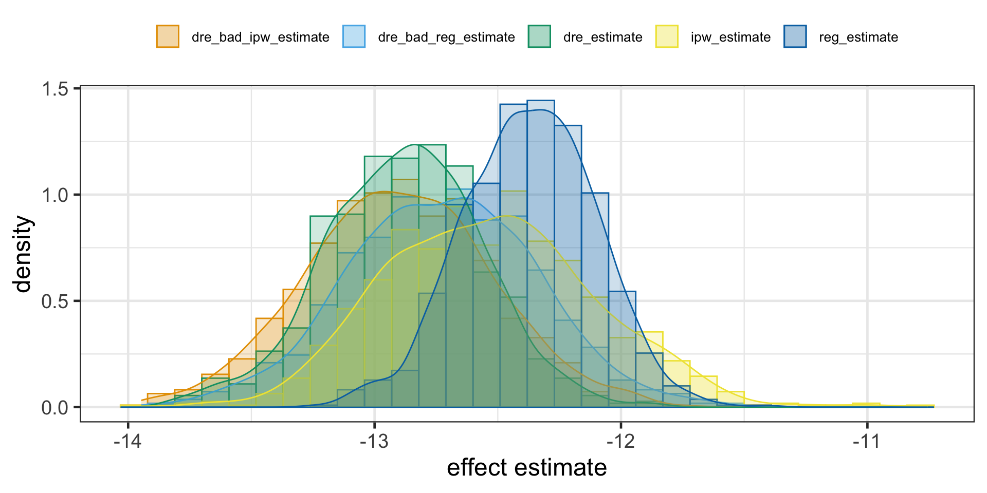 doubly_robust_bad_reg <-function(df, X, D, Y){ ps <-# propensity scoreas.formula(paste(D, " ~ ", paste(X, collapse="+"))) |> stats::glm( data = df, family =binomial() ) |> broom::augment(type.predict ="response", data = df) |> dplyr::pull(.fitted) mu0 <-rnorm(dim(df)[1], 0, 1) # wrong mean response D == 0 mu1 <-rnorm(dim(df)[1], 0, 1) # wrong mean response D == 1# convert treatment factor to integer | recast as vectors d <- df[,D] |> dplyr::pull(1) |>as.character() |>as.numeric() y <- df[,Y] |> dplyr::pull(1)mean( d*(y - mu1)/ps + mu1 ) -mean(( 1-d)*(y - mu0)/(1-ps) + mu0 )}