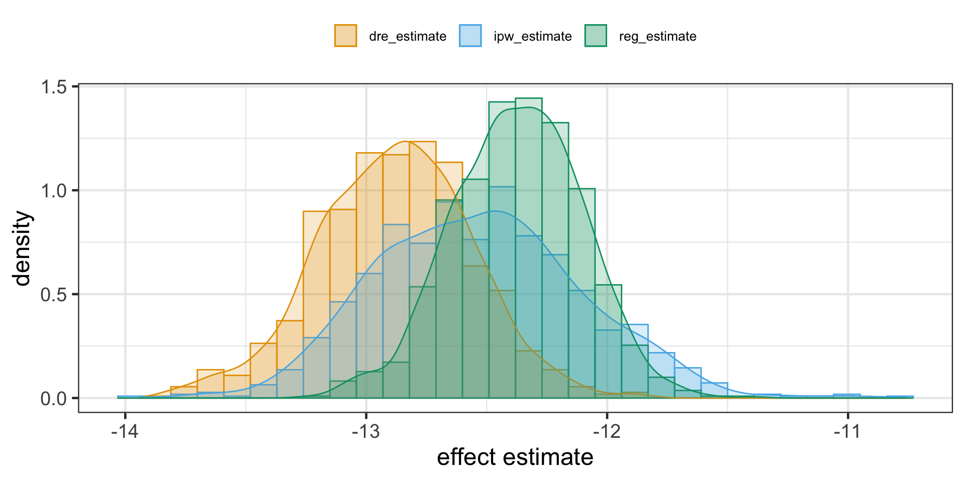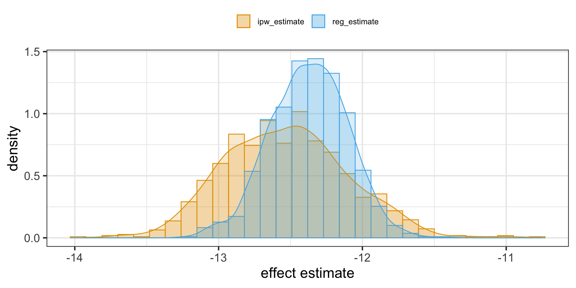 both_results_dat <- both_results |> dplyr::mutate(reg_estimate = purrr::map_dbl( reg_fits,# pull the `estimate` for net for each fit \(.fit) .fit |> dplyr::filter(term =="net") |> dplyr::pull(estimate) ) , ipw_estimate = purrr::map_dbl( ipw_fits,# pull the `estimate` for net for each fit \(.fit) .fit |> dplyr::filter(term =="net") |> dplyr::pull(estimate) ) )