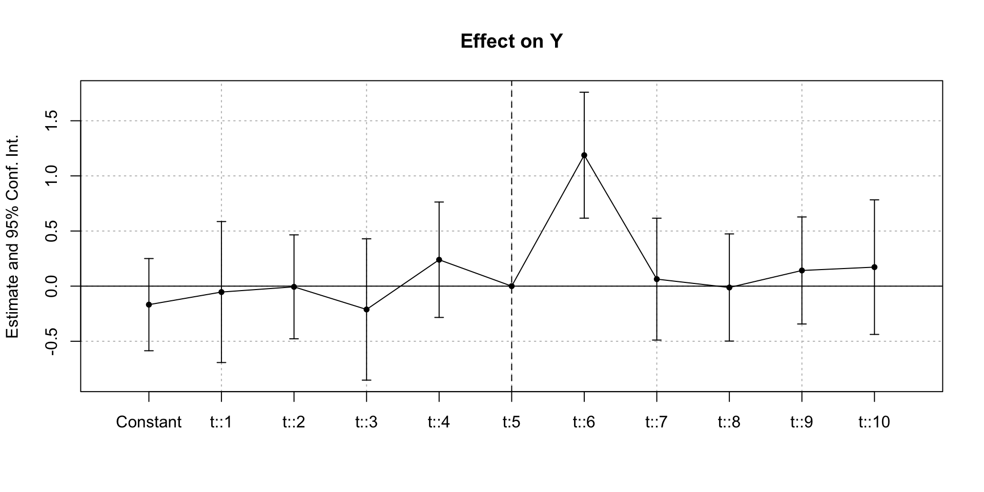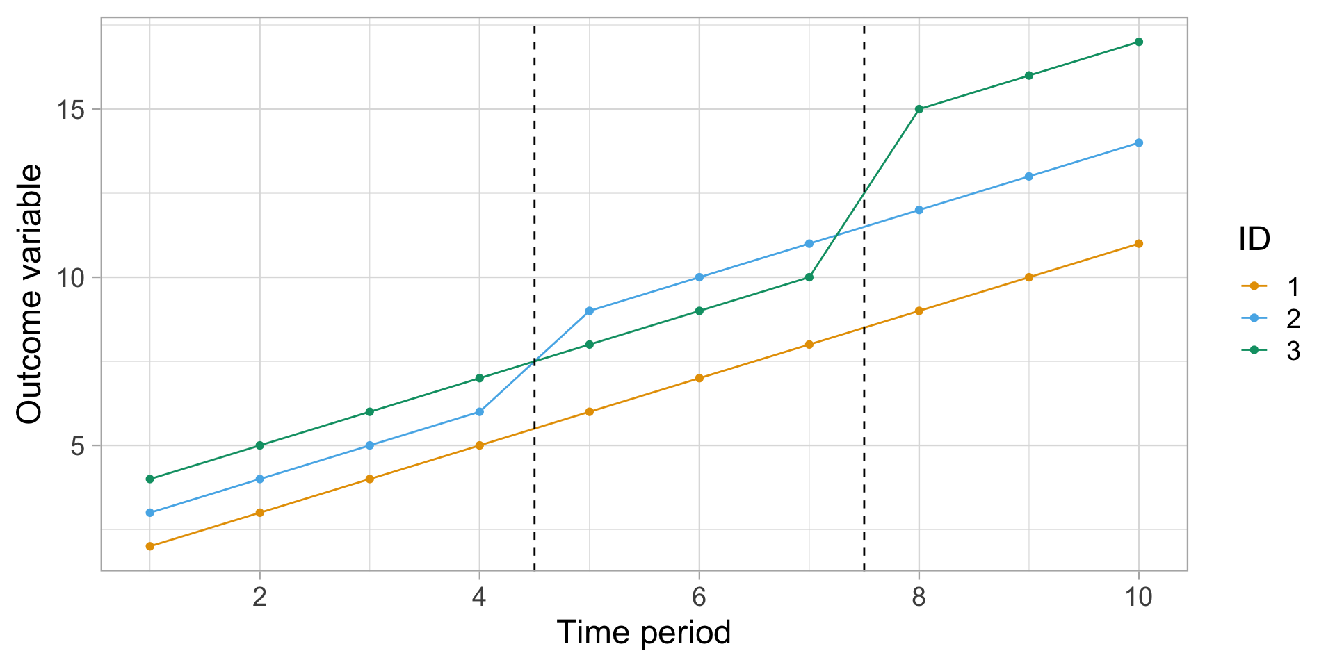 Here we see that our simulation includes two distinct treatment periods. The first treatment occurs at period 5, where group_id=2’s trendline jumps by 2 units. The second treatment occurs in period 8, where group_id=3’s trendline jumps by 4 units. In contrast, id=1 remains untreated for the duration of the experiment.