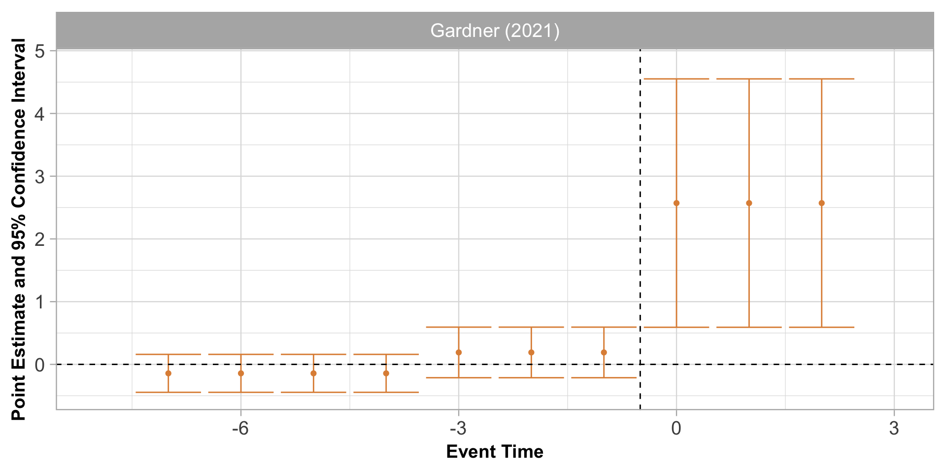 regress the output residuals on the treatment residuals \(\tilde{y}_{igt} = \tau\tilde{D}_{gt} + \tilde{\varepsilon}_{gt}\)