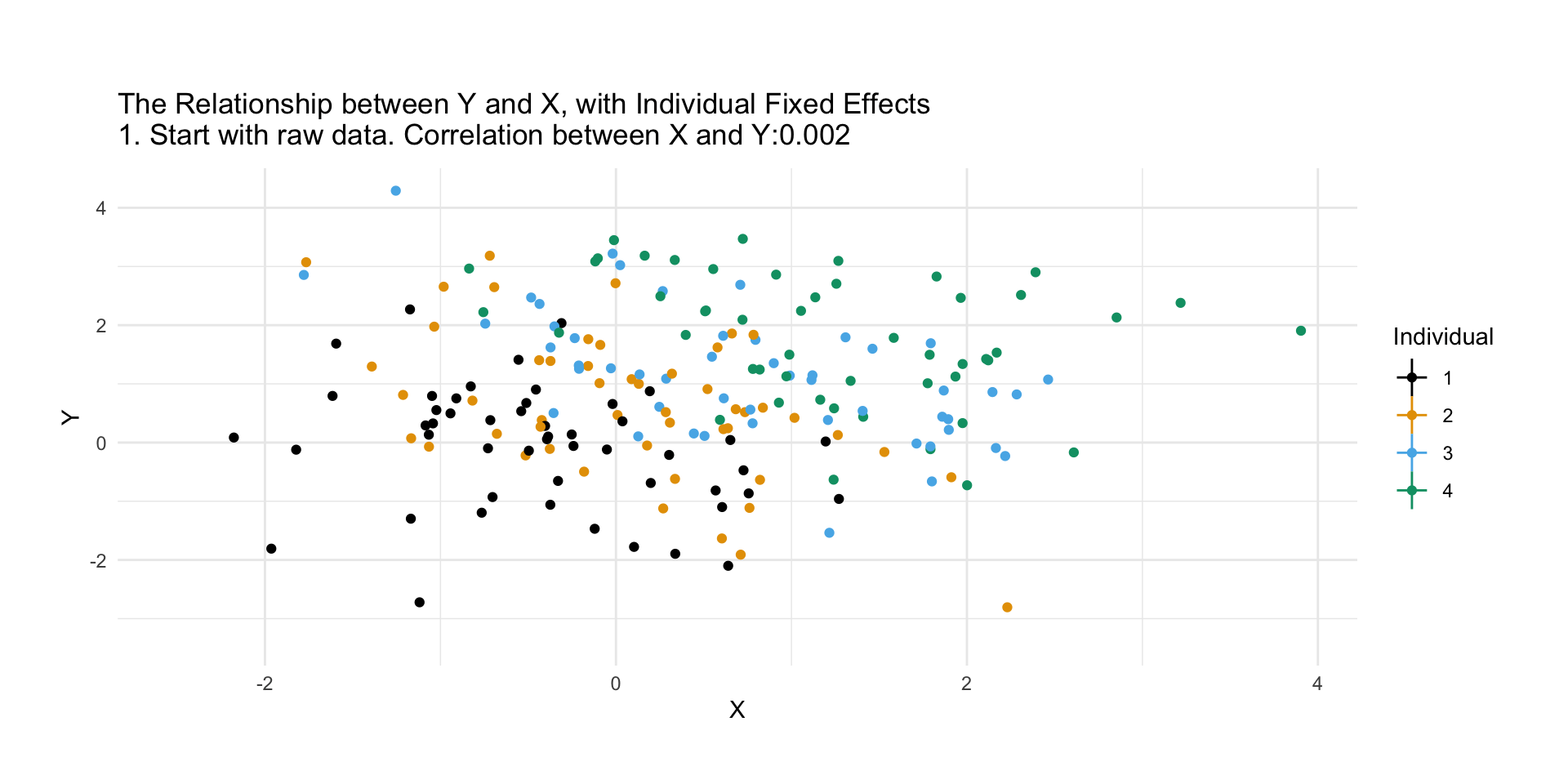 require(ggplot2, quietly =TRUE)#theme_set(theme_bw(base_size = 22))ggplot(dat4_rev, aes(x = period_id, y = outcome, col =factor(group_id))) +geom_point() +geom_line() +geom_vline(xintercept =c(4.5, 7.5), lty =2) +scale_x_continuous(breaks = scales::pretty_breaks()) +labs(x ="Time period", y ="Outcome variable", col ="ID") +theme_light(base_size =18)