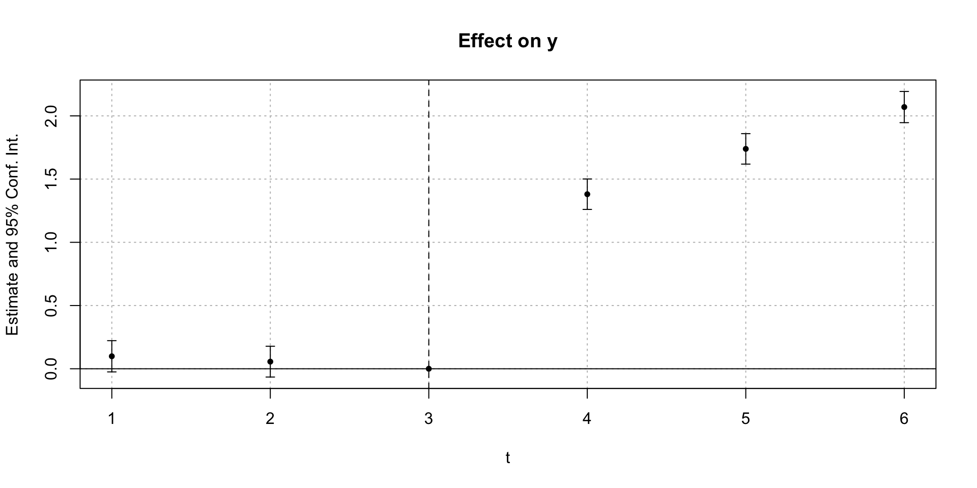set.seed(10)# Create data with 20 groups and 10 time periodsdf <- tidyr::crossing(id =1:20, t =1:10) |># Add an event in period 6 with a one-period positive effect dplyr::mutate(Y =rnorm(dplyr::n()) +1*(t ==6))# Use i() in feols to include time dummies,# specifying that we want to drop t = 5 as the referencem <- fixest::feols(Y ~i(t, ref =5), data = df, cluster ='id')# Plot the results, except for the intercept, and add a line joining them # and a space and line for the reference groupfixest::coefplot(m, drop ='(Intercept)',pt.join =TRUE, ref =c('t:5'=6), ref.line =TRUE)