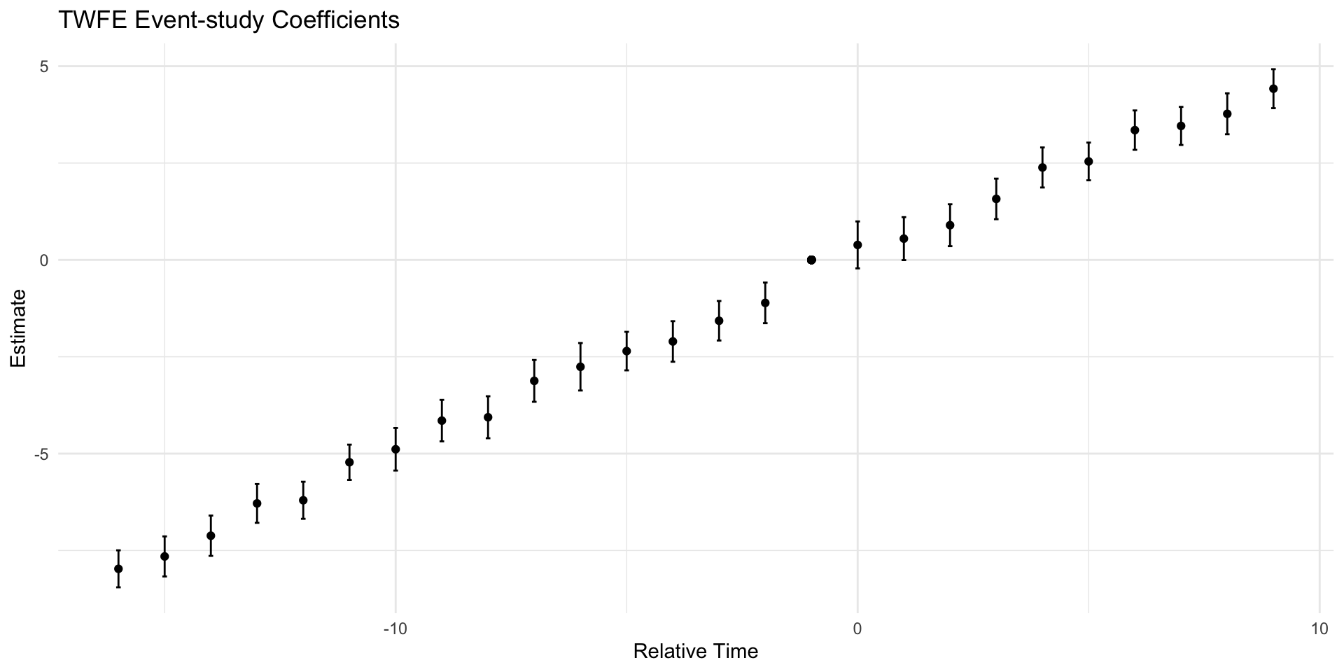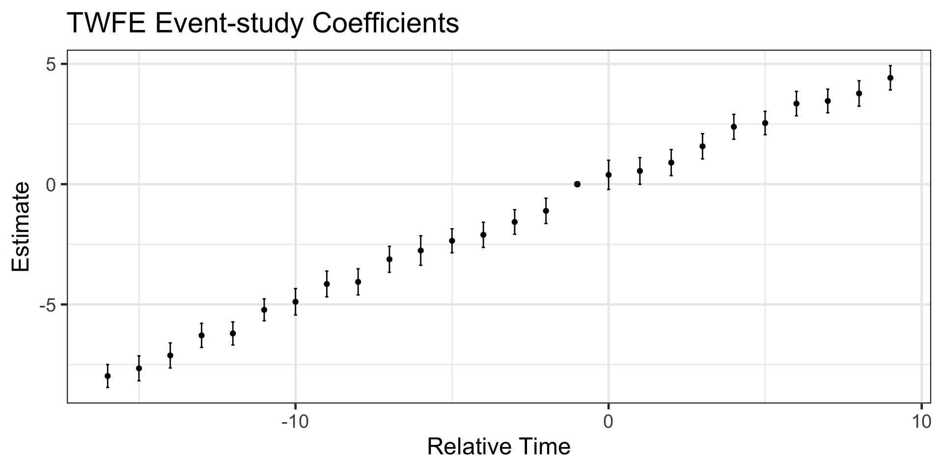 The dynamic (TWFE) regression specification is, for period \(t\in{-T,\ldots,T}\) and treatment at T=0: